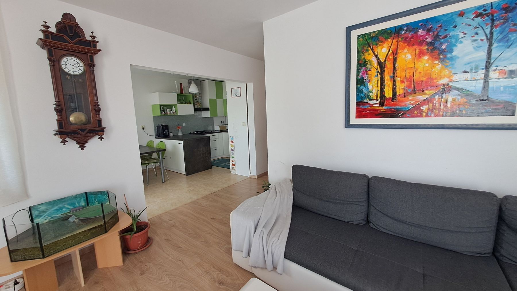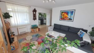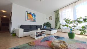 Priestor je otvorený a prirodzene prepojený s kuchyňou, čo vytvára príjemný spoločenský priestor pre rodinu aj návštevy.