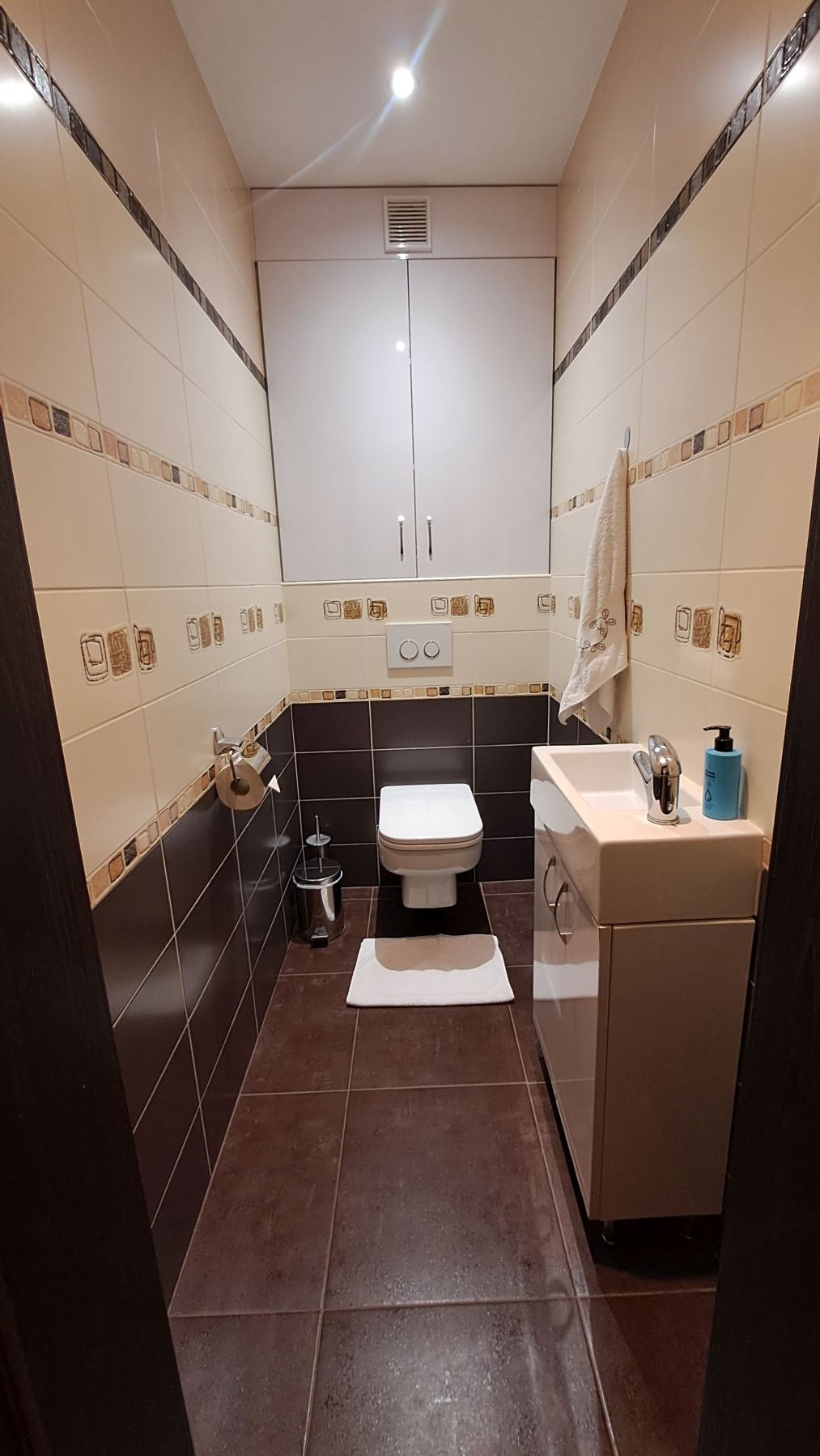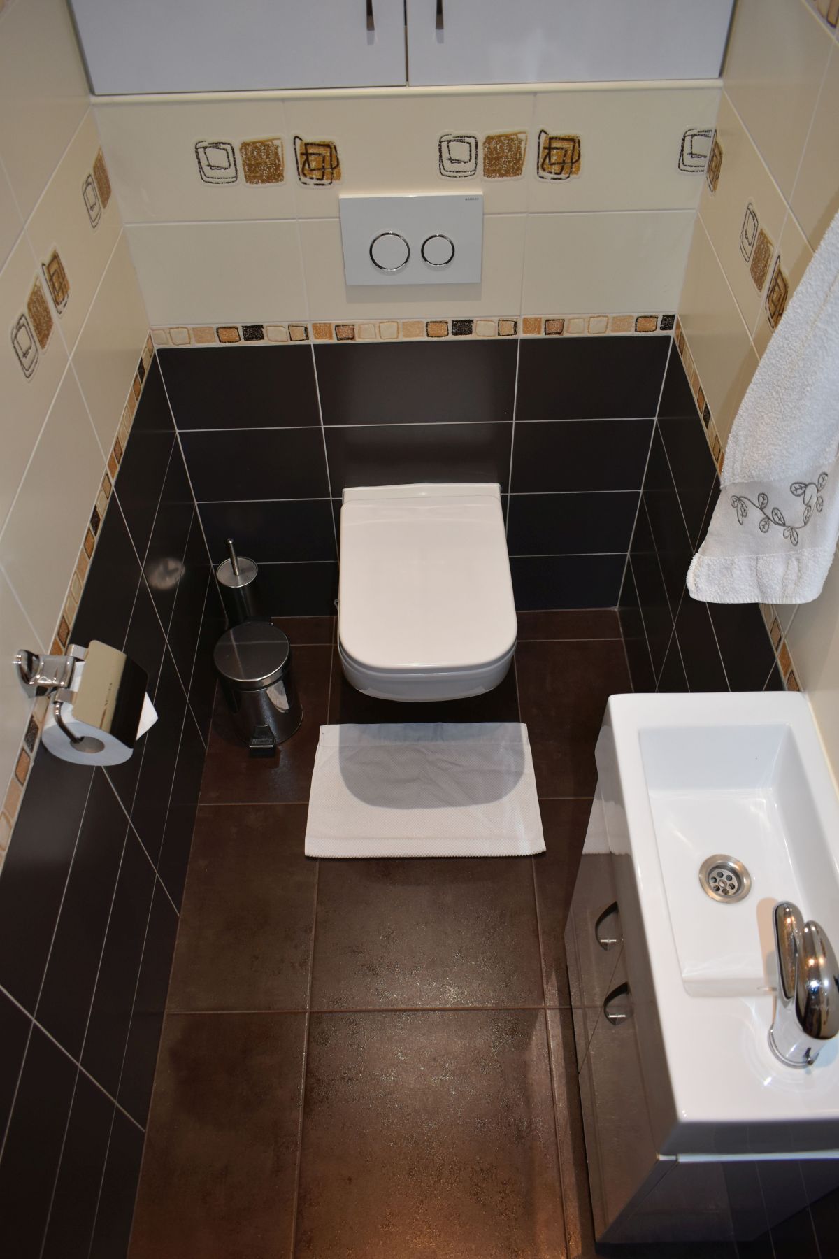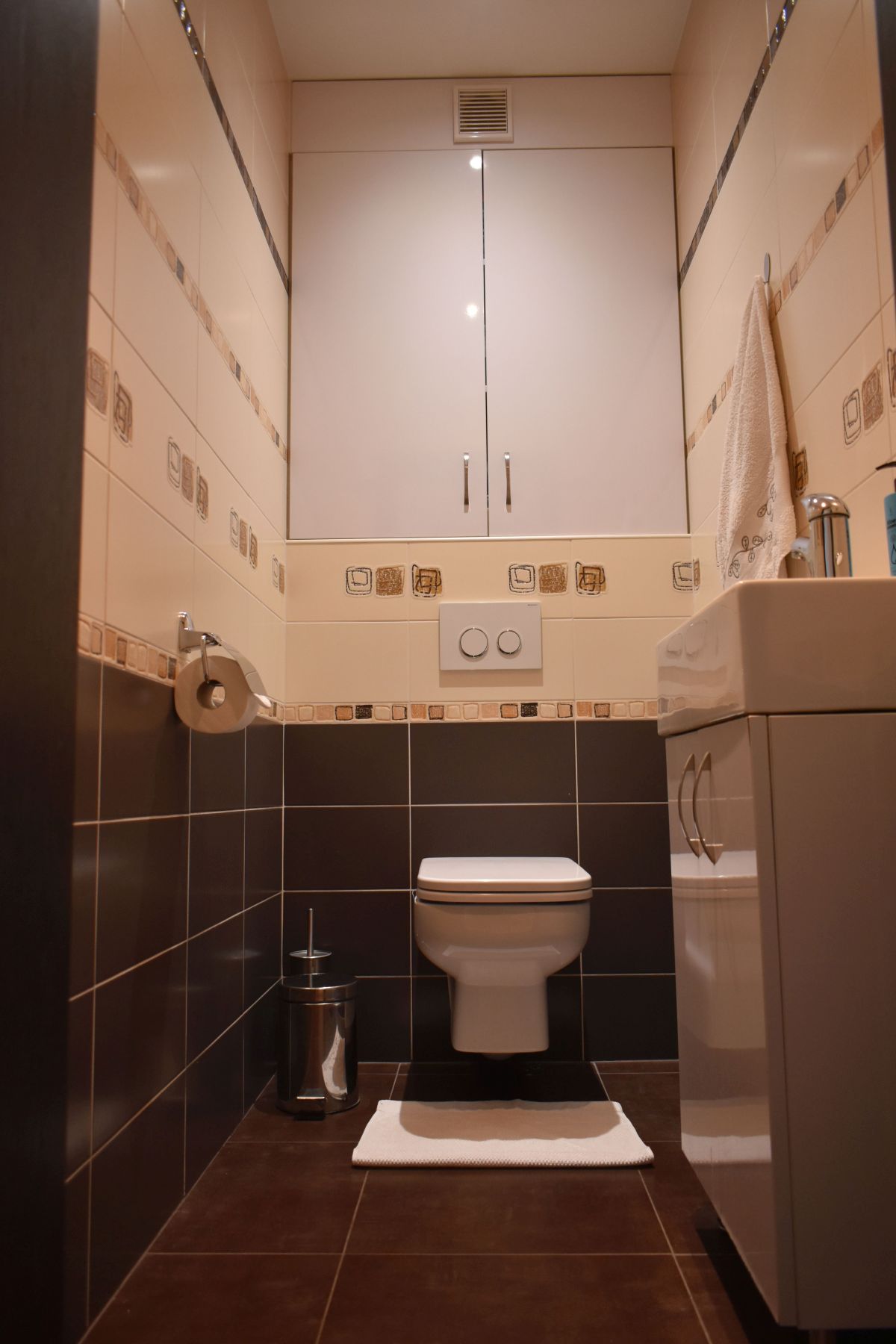 Rovnako ako kúpeľňa je riešené moderne s dlažbou, ľahko udržiavateľné a praktické pre rodinu aj návštevy.