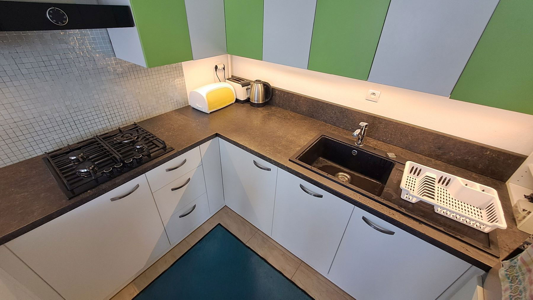 Kuchyňa je priestranná, v tvare U a bola navrhnutá na mieru tak, aby spĺňala princíp pracovného trojuholníka – sporák, drez a chladnička sú umiestnené ideálne pre pohodlné varenie.